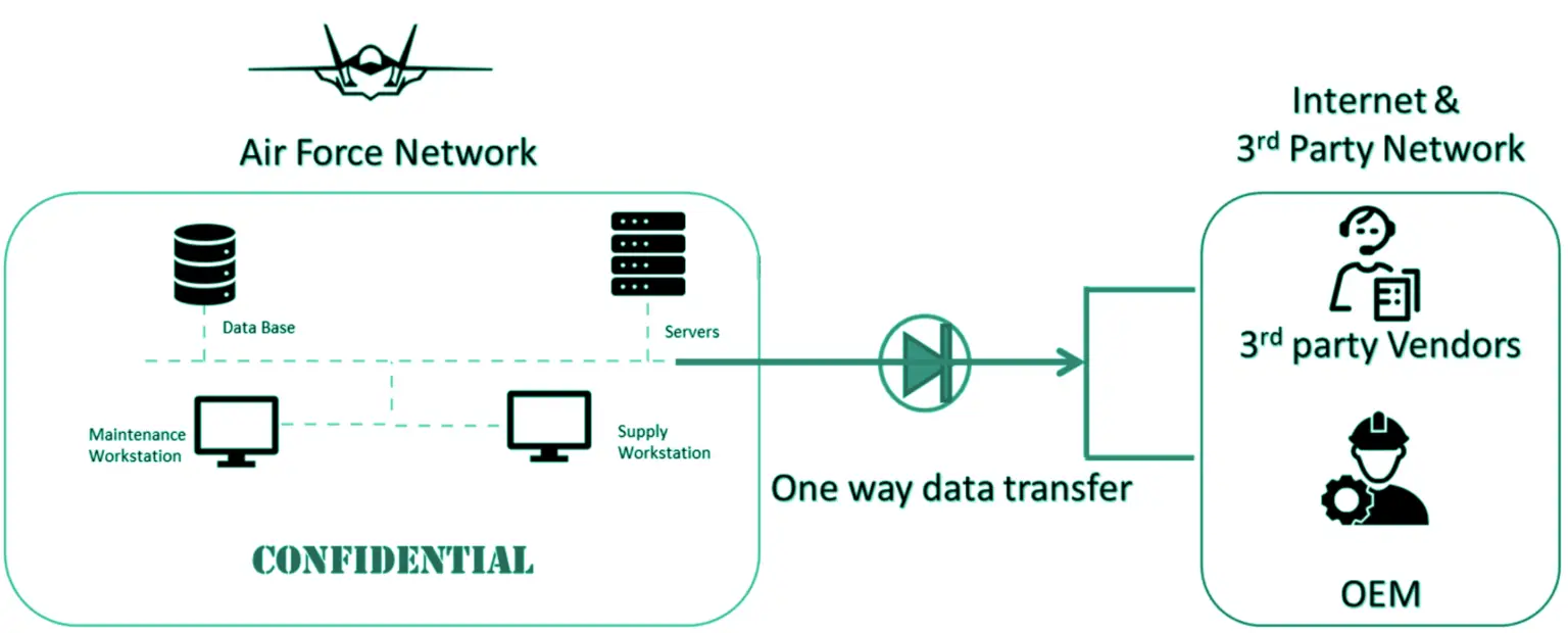 An Air Force customer needed to provide external OEMs and maintenance contractors with access to in-service support data — including logistics information, spare parts availability and maintenance records — in order to maintain fleet readiness and ensure efficient sustainment operations. These systems, however, were hosted within protected military networks containing mission-critical and confidential information. The challenge was therefore to enable controlled data sharing toward external partners while strictly preventing any inbound access or exposure of sensitive defense systems.